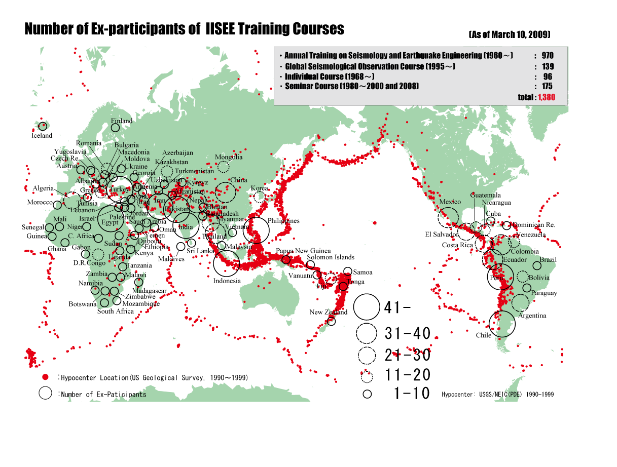 The International Institute of Seismology and Earthquake Engineering (IISEE), at the Building Research Institute (BRI), was originally established in January 1962 as an organization dedicated to training to researchers and engineers in developing countries and to carrying out researchers to contribute to earthquake disaster mitigation. Currently, IISEE carries out training courses with the Japan International Cooperation Agency (JICA) and offers following three training programs. A total of 1,380 participants from 96丂countries and region have completed the training courses, and these courses have received high praises in Japan and around the world. The IISEE-net (information network of earthquake disaster prevention technologies for buildings), which is accessible via the IISEE website, is effectively used by participants for their follow-up studies. |